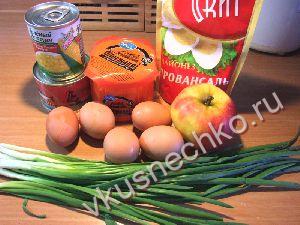Украсить кукурузой и зеленью. Дать постоять 30-40 минут в холодильнике.