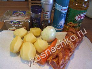 - На 2 литровую кастрюлю понадобится: Грудинка сырокопченая или бекон: 250 г