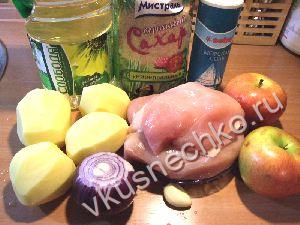 Очищенную картошку, лук и яблоки разрезать вдоль на 4-6 частей. |