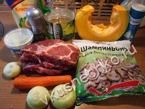 На свинину выложить поджаренные грибы с луком и морковью, поверхность разровнять. Запекать 45 минут при температуре 180оС. |