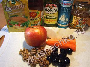 Заправить масляно-медово-горчичной заправкой, немного посолить и хорошо перемешать. |