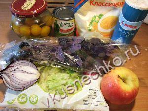 Яблоки очистить от сердцевины (кожицу по желанию тоже можно срезать), порезать кубиками среднего размера. Лук очистить и тонко порезать. С маринованных помидорчиков снять шкурку и разрезать их на небольшие ломтики. Веточки базилика крупно порезать. |