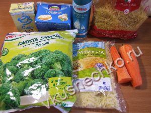Брокколи с морковкой прикрыть оставшейся третью вермишели. Последний слой полить смесью из 100 мл горячих сливок и 2 столовых ложек плавленного сыра. |