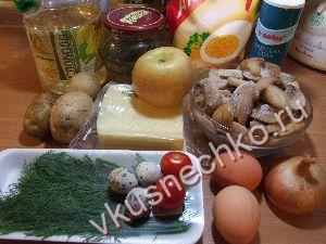 Сделать грибочки из перепелиный яиц и половинок помидоров черри, установить их на салат. Края посыпать зеленью укропа. Отправить готовый салат в холодильник на 1 час. Приятного аппетита! |