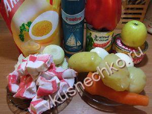 Готовых кальмаров (консервированных или вареных), крабовое мясо и вареные яйца порубить кусочками среднего размера. |
