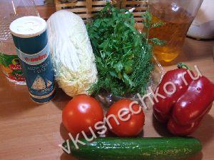 Все овощи тщательно промыть, обсушить салфеткой. Сладкий перец очистить от семян, порезать поперек кольцами толщиной 0.5-1 см. Помидоры и огурец нарезать кружочками такой же толщины. На большое плоское блюдо разложить веером листья китайской капусты или листового салата. На каждый лист салата положить по одному колечку перца, внутри перца разместить по одному кружочку помидора и огурца, украсить веточками петрушки и укропа. Сбрызнуть овощи уксусом, посолить по вкусу и полить душистым подсолнечным маслом. Приятного аппетита! |