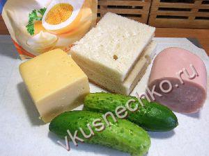 Нарезать хлеб, сыр, ветчину и огурец квадратами со стороной 2-3 см и толщиной 7-10 мм. |