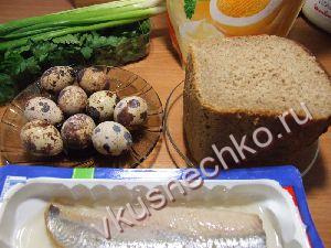 Перепелиный яйца сварить вкрутую, очистить и разрезать вдоль напополам. Черный хлеб (лучше взять хлеб *кирпичиком*) нарезать ломтями толщиной 0.5 см, удалить корки, каждый ломоть разрезать на 9 квадратиков. Зеленый лук промыть, нарезать полосками 2-3 см длиной. |