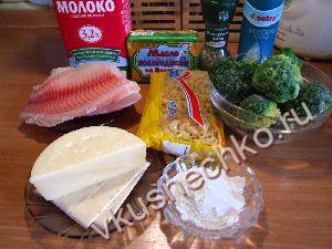 На рыбу выложить брокколи и макароны с соусом. |