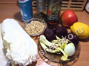 Нарезать свеклу и яблоко тонкой соломкой. Репчатый лук очистить, мелко порезать. Сельдерей промыть, нарезать маленькими кусочками. |