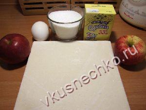 Готовое слоеное тесто порезать на 12 квадратов со стороной 10 см. (Каждый лист теста разрезать на 4 части). |