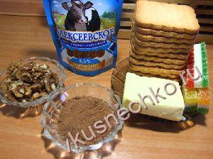 Смешать раскрошенное печенье с размягченным (не топленым) сливочным маслом и сгущенным молоком в крутое тесто. Тесто разделить на 3 части. |