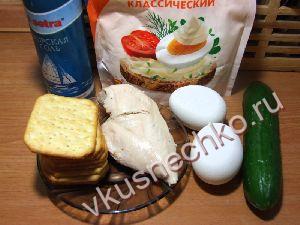 Смешать яйца, куриное мясо, огурец, добавить чеснок, пропущенный через пресс, посолить, поперчить по вкусу. Заправить майонезом и хорошо перемешать. Масса должна получиться густой, но не рассыпчатой. |