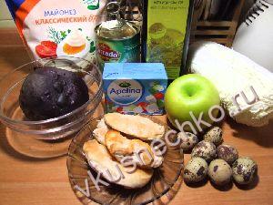 Сверху выкладываем перепелиные яйца, разрезанные напополам. Вместо перепелиных яиц можно использовать измельченные куриные. Украсить зеленью. Накрыть салат пищевой пленкой и дать ему постоять 2-3 часа в холодильнике. Приятного аппетита! |