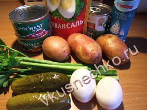 Картошку тщательно промыть со щеткой, положить в кипящую воду, не очищая, варить до готовности (около 20 минут). Яйца помыть, сварить вкрутую (около 7 минут). Для упрощения процесса яйца и картошку варю вместе, но яйца вылавливаю из кастрюли раньше. |