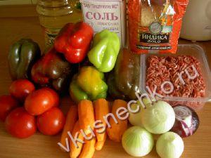 Начинить полученным фаршем перцы и уложить их в кастрюлю на оставшуюся половину тушеных овощей. Накрыть крышкой и готовить на медленном огне 30-40 минут. Подавать к столу со сметаной. Приятного аппетита! |