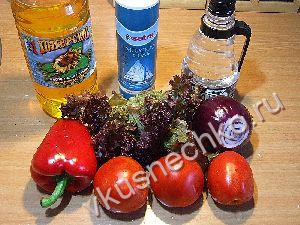 Все порезанные овощи уложить вперемежку на листья салата, посолить, сбрызнуть уксусом и полить душистым подсолнечным маслом (или нерафинированным оливковым маслом).