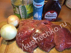 Говядину порезать небольшими кусочками, залить маринадом и поставить в холодильник на 4-24 часа (чем дольше мариновать, тем мягче получается мясо). |
