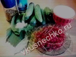 Тщательно вымытые специи и чеснок сложить на дно банки, сверху плотно уложить огурцы и красную смородину. Залить горячим маринадом. |