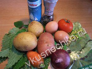 Положить крапиву и помидоры в кастрюлю со сварившимися овощами, посолить, поперчить, добавить лавровый лист и варить все вместе еще 10 минут. |