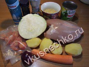 Капусту и лук тонко порезать, картофель нарезать кубиками, морковь натереть на терке. |